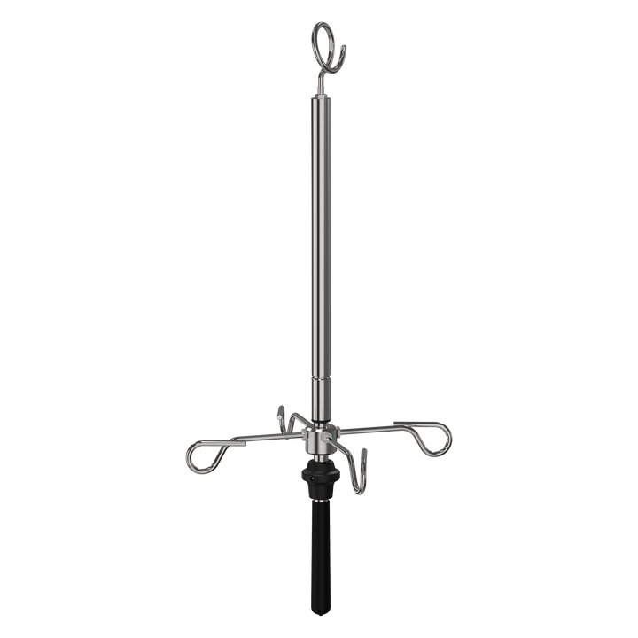 Stainless steel body with stainless steel ram horns and extender rod. One hand push button operation allows for up to 11 inches of adjustment. Used for ceiling heights up to 8'-6".
